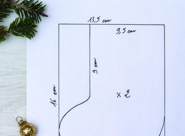 Tracez un rectangle de 13,5 x 16 cm sur du papier. Tracez une ligne de 9cm à 9,5cm du côté droit. Dessinez une botte et la découper.
