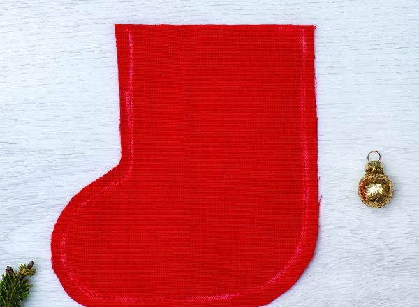 Epinglez la botte en papier sur un tissu plié en deux et couper en ajoutant 1cm tout autour sauf en haut.