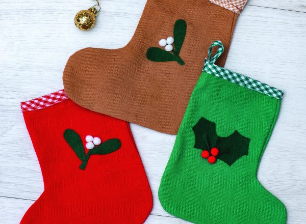 Découpez des feuilles de houx et de gui en feutrine. Les coudre avec les pompons et des nœuds pour décorer la botte. Vous pouvez également découper des numéros de 1 à 24 dans la feutrine pour les coudre sur chaque botte ou les dessiner à l’aide d’un feutre pour tissu.